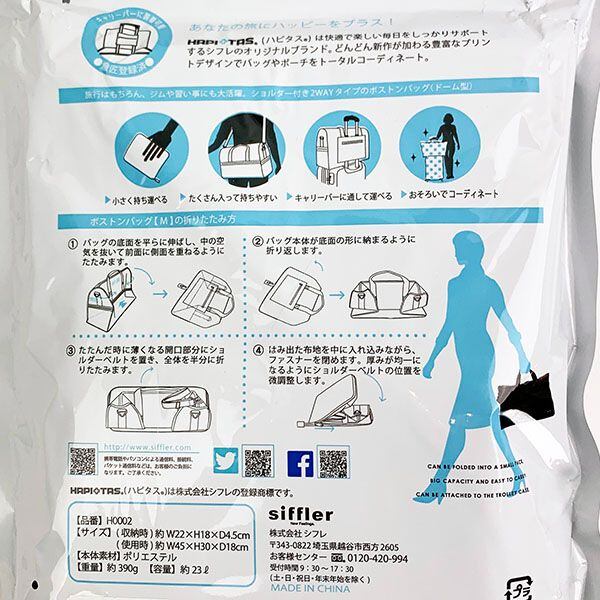 コンパクトに折りたためるボストンバッグ。収納時サイズ 22×18×4.5 重量390g 容量23リットル 旅行はもちろん、ジムや習い事にも。ショルダー付き2WAYタイプのボストンバッグです。