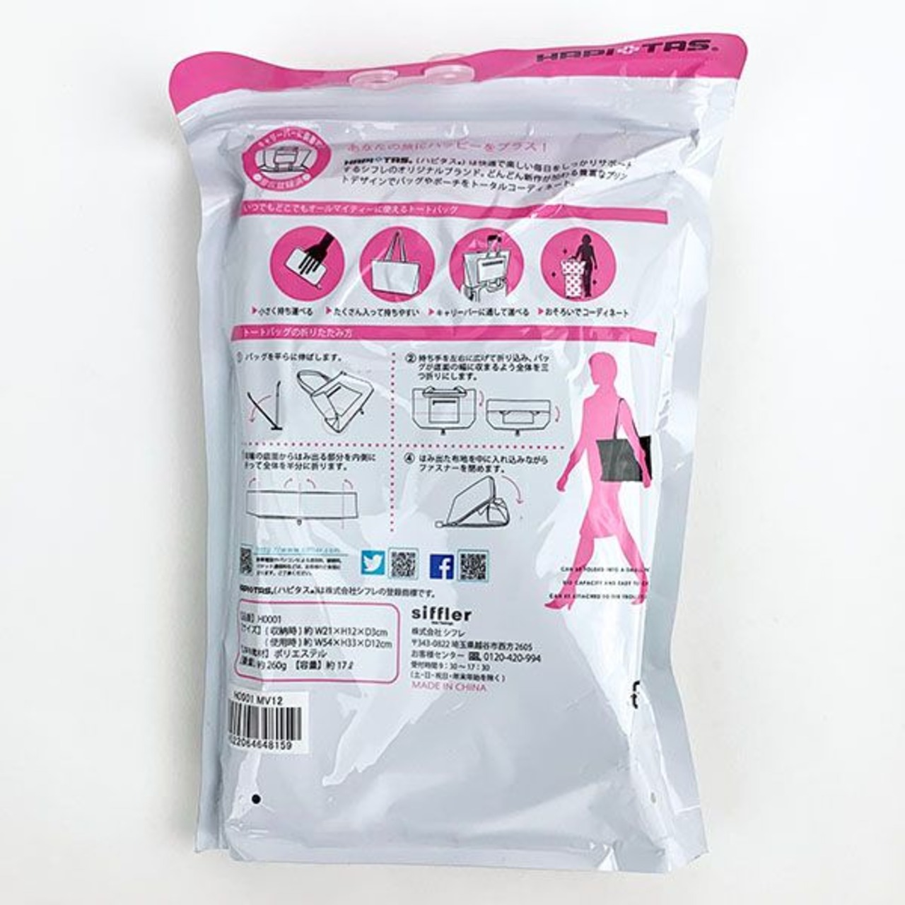 いつでもどこでもオールマイティーに使えるトートバッグ。収納時21×12×3 重量260g 容量17リットル 裏面にキャリーバー通しがついてキャリーオン移動も可能。普段のサブバッグ・ショッピングバッグとしてもおすすめです。