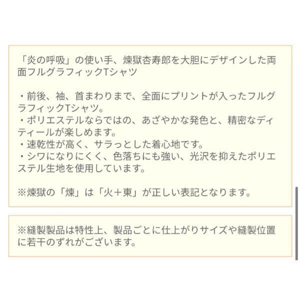無限列車編のキービジュアルが大胆にデザインされた両面フルグラフィックTシャツ。シワになりにくく、色落ちにも強い、光沢を抑えたポリエステル生地を使用。速乾性が高く、サラっとした着心地です。君も胸に煉獄の炎を燃やそう!!※「煉獄杏寿郎」の「煉」は「火+東」が正式表記になります。