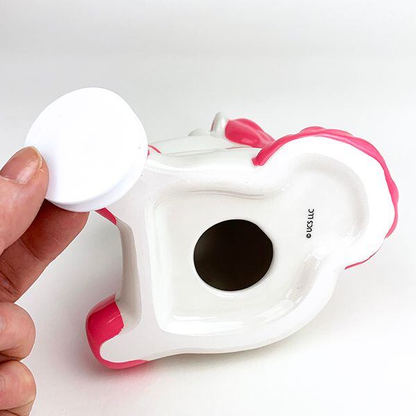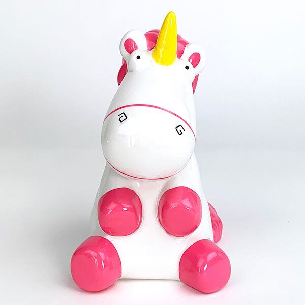 ミニオンズに登場するユニコーンの『フラッフィー』がかわいい貯金箱になりました。大きさもちょうどよくてお部屋においておくだけで、インテリアにもなります!底にフタがついているのでいつでも中身を取り出せますし、割らなくていいので繰り返しお使いいただけますね♪
