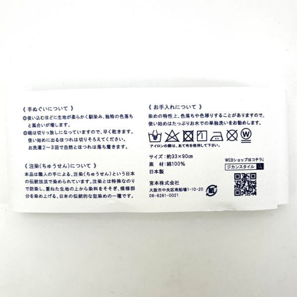 注染の手ぬぐいです。注染は糸そのものを染めているので、表裏のないきれいな染めあがりになります。鮮やかな色とデザインから、インテリアとしても注目されているんですよ!別売りのマグネット式タペストリー棒を使えば、穴も開けずに飾ることができます。宮本株式会社さんの手ぬぐいは、天然素材、そして国産にこだわっています。手ぬぐいは、使い込むほどにやわらかく、使う人になじんでくるそうです。たくさん使ってあなた好みの手ぬぐいに“育てて”ください!※初めて洗う時は色落ちをします。お湯ではなく、極力お水で洗い、色落ちを防ぐためなるべく陰干しをしましょう。※ほつれについて。手ぬぐいの端は切りっぱなしとなっています。ほつれた糸ははさみで切ってください。使っていくうちにほつれは収まりフリンジ状に落ち着きます。◆サイズ:縦90×横33cm