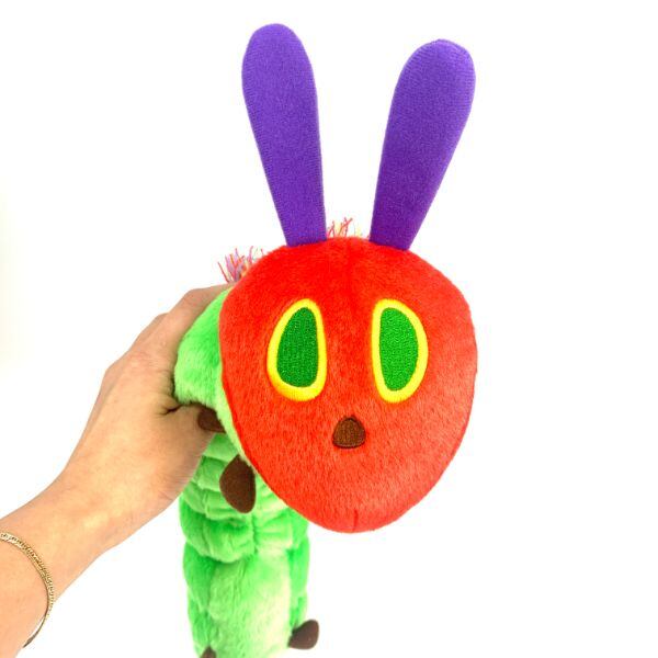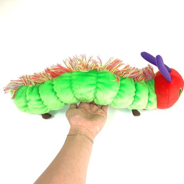 はらぺこあおむしって立体的になるとこうなんですね…どこかに隠れていたらいたらなかなかにびっくりする造形です。印象的なおかおと背中のカラフルなもしゃもしゃが効いています!少し毛足が長めでさらさらした手触り。ファンにはたまらないですね!◆触覚含むサイズ 高さ約15×長さ約45×太さ直径約8cm
