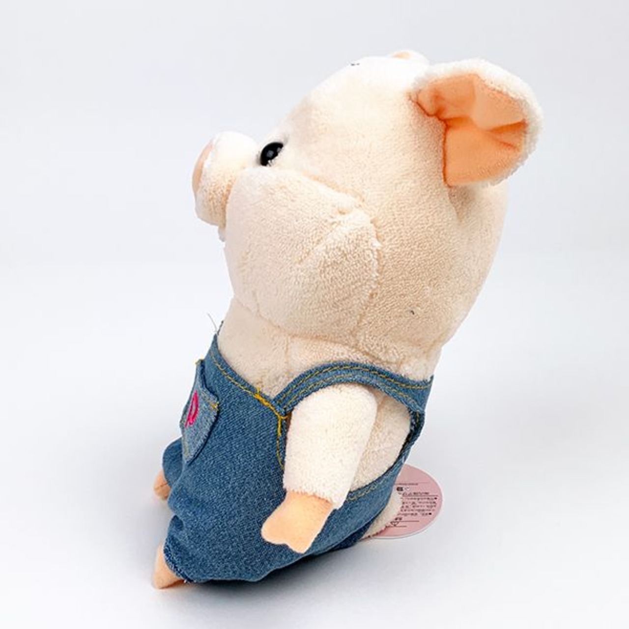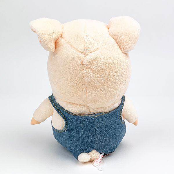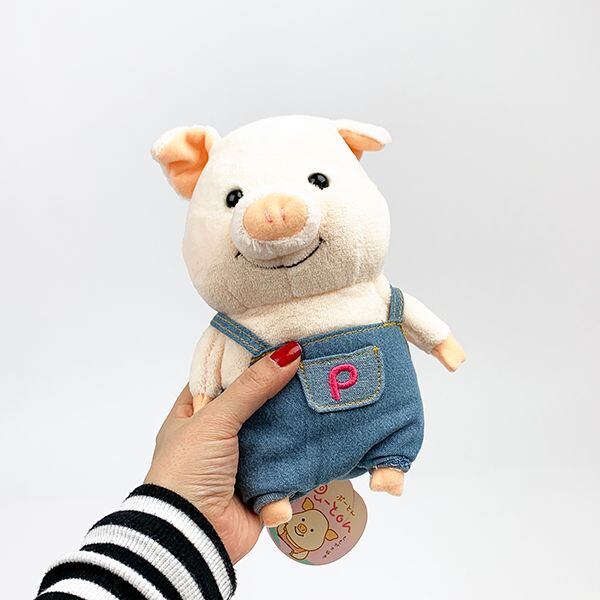 くったりした柔かい感触が心地よい、かわいいこぶたの「ぷーとん」のぬいぐるみです。デニムのオーバーオールと、くるんと巻かれた背面のしっぽがポイントです。【サイズ】高さ21cm