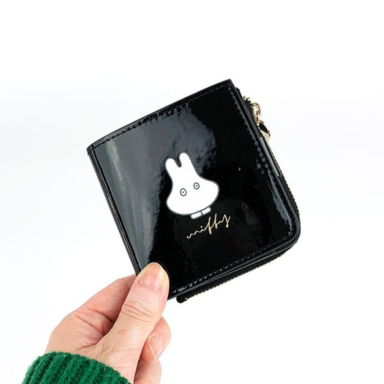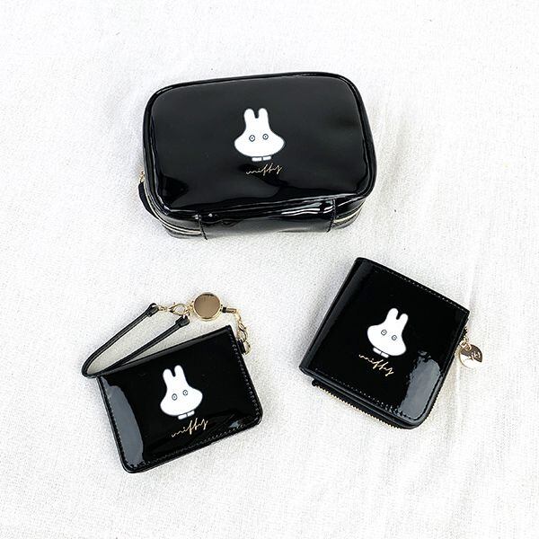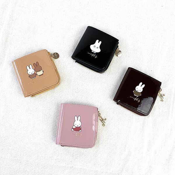 まるでチョコレートのような光沢のあるエナメル素材を使用。ミッフィーたちのプリントとゴールドのワンポイントで年齢問わず持ちやすいデザインに。