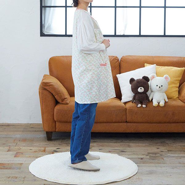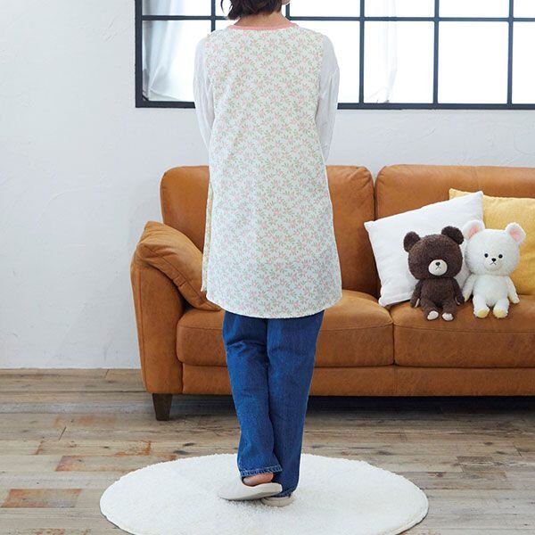 かぶってウエストのボタンを留めるタイプのエプロンです。簡単に着られて便利!お尻くらいの丈なので動きも制限されません。大きなポケットもポイント!幼稚園や保育園の先生にも人気のカタチです♪M〜L(フリー)/バスト79〜94cm、身巾54cm、身丈84cm、裾巾65cm