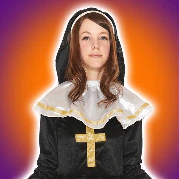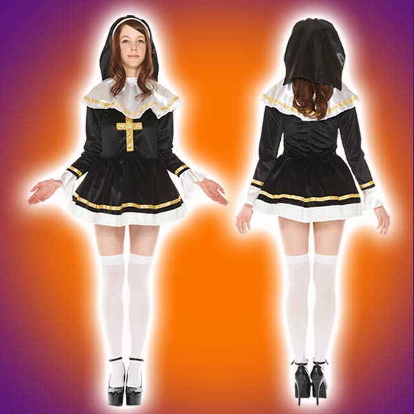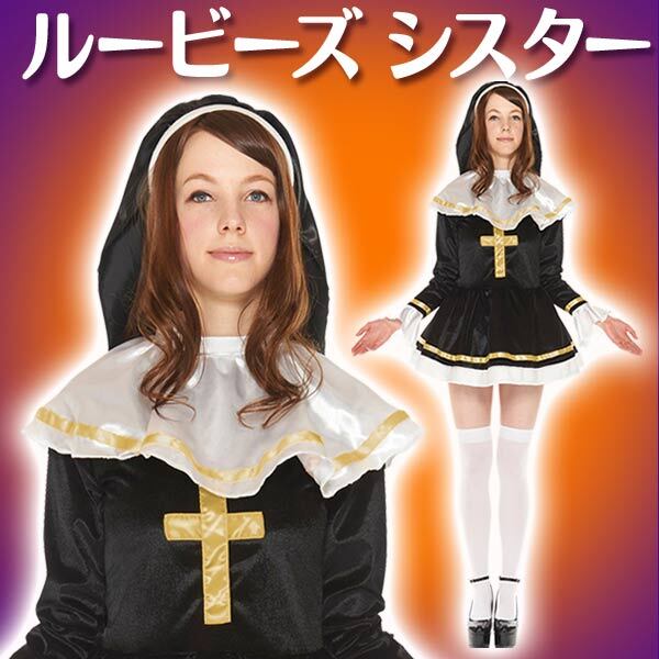 とてもかわいいシスターの女性用コスチュームです。モノトーンのドレスにゴールドのラインや十字架がアクセントに。ハロウィンやパーティーなど特別な夜は、あなたもシスターに変身してみませんか♪