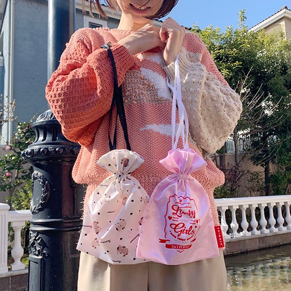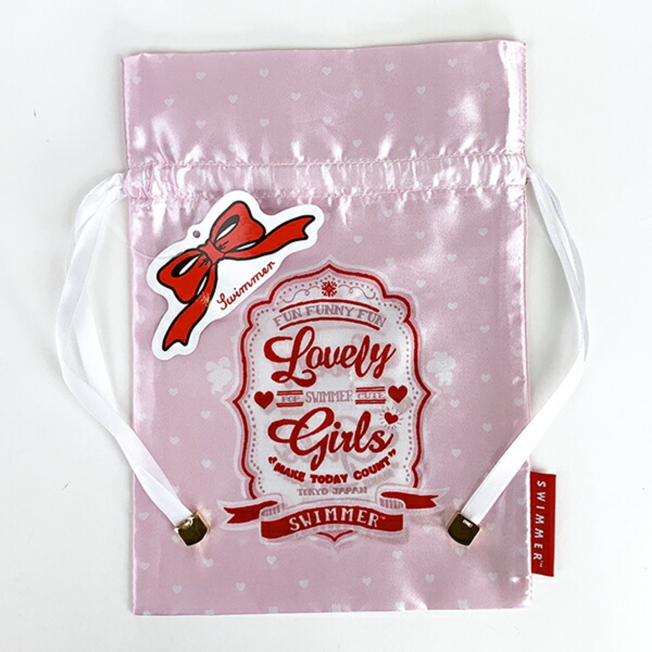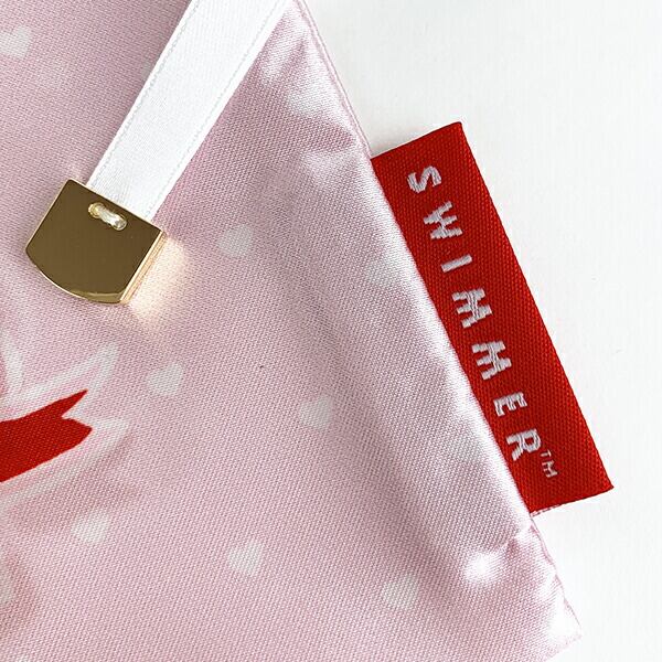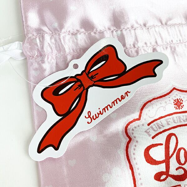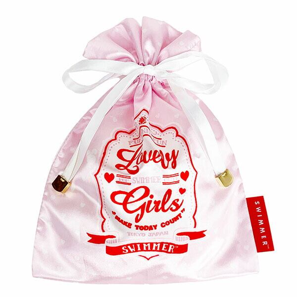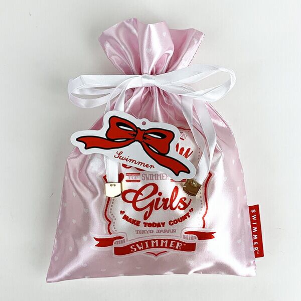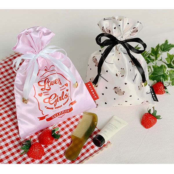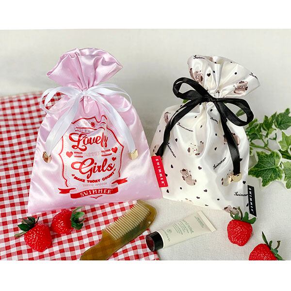 おしゃれなサテン地の巾着はグッとカバンの中を華やかに。お菓子を入れても、コスメを入れても・・使い勝手抜群です!ピンクとブラックの2柄。オトナっぽさをテーマにしています。スマホもすっぽり入るしっかり入る優れもの♪紐のエンドのメタルチャームと、SWIMMERの文字が入ったタグがこだわりです。