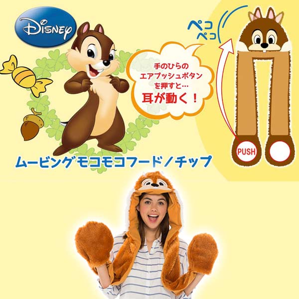 みんな大好き「チップ&デール」のチップモチーフのモコモコフードです。手の平のポンプをプッシュすれば、両耳がピョコピョコ動きます!これをかぶるだけで、とってもキュートなチップに簡単変身!大好きなディズニーキャラになりきっちゃおう!!Halloweenのコスプレ、クリスマスのパーティ衣装に最適♪<br>