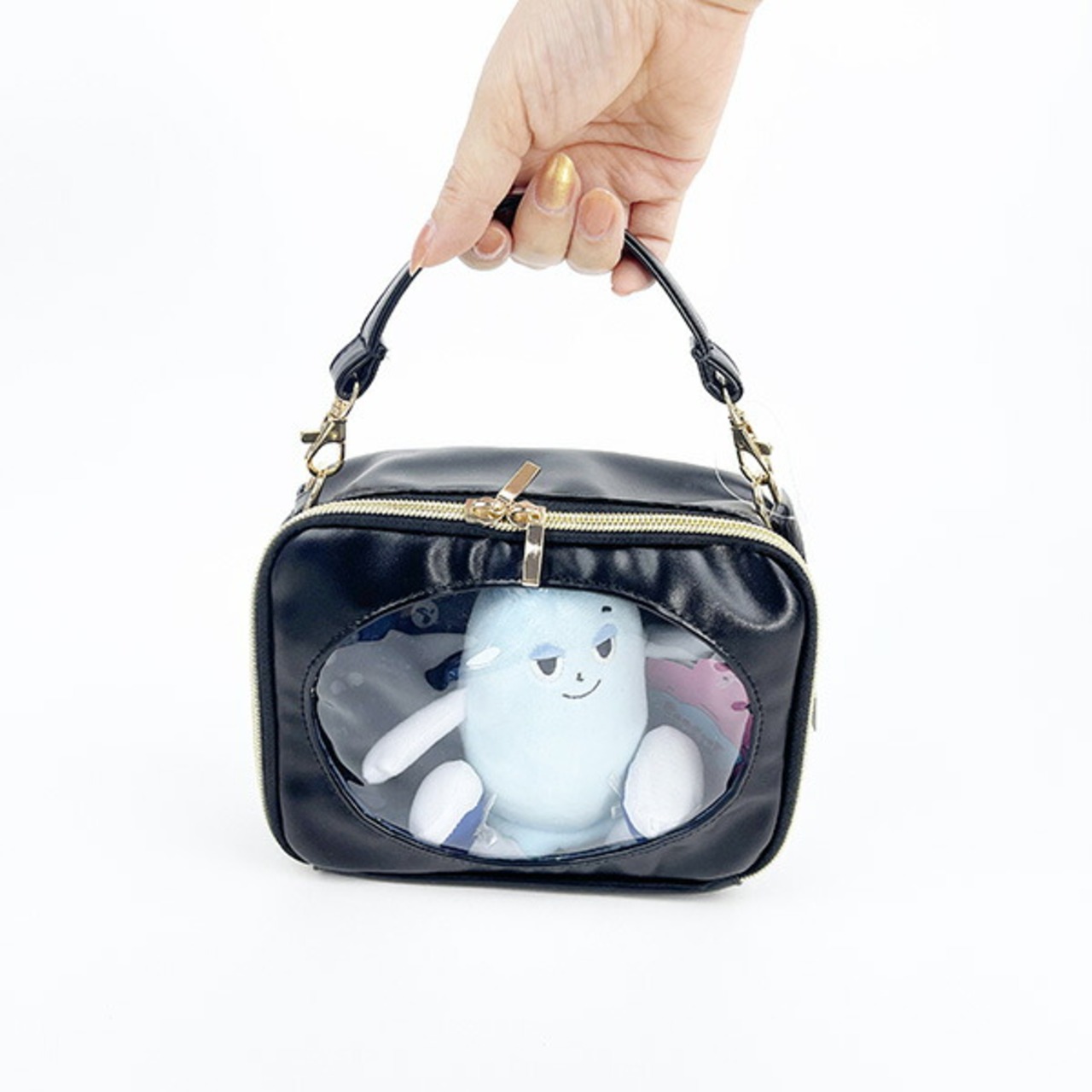 大きな窓が付いていて中身が見える仕様がポイント!ぬいぐるみやフィギュアなど、見せたいアイテムをいれてね!!バッグやポシェットの2WAYが嬉しい♪