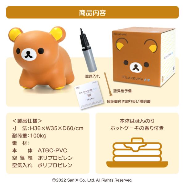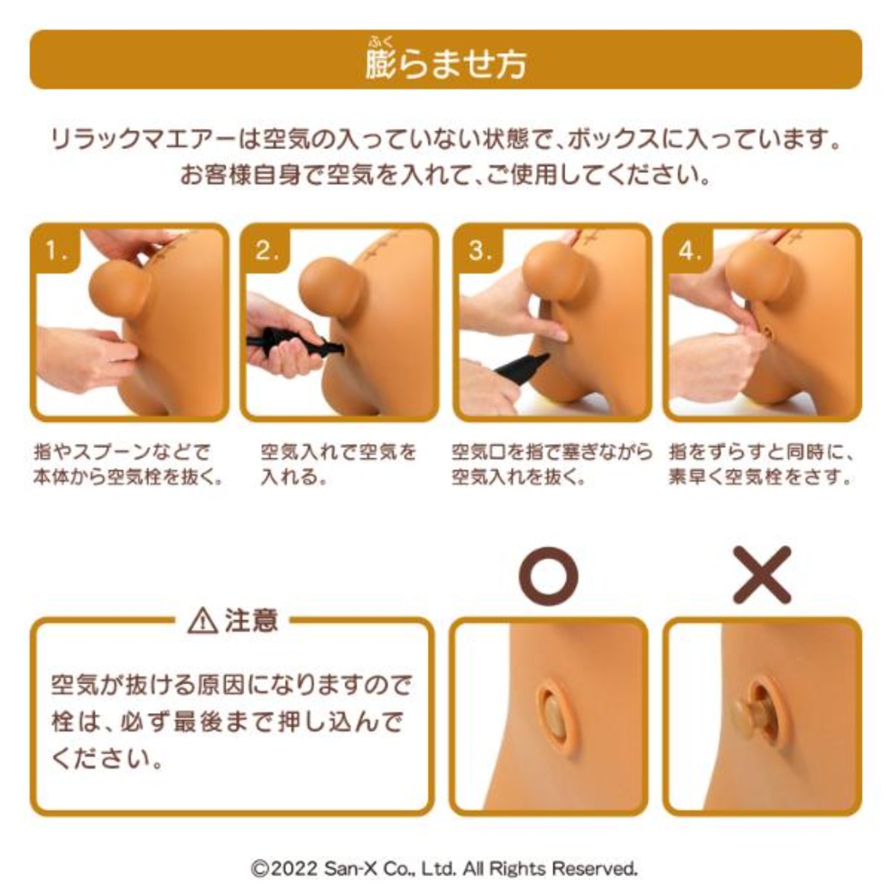 リラックマの乗用トイ”リラックマエアー”です。乗って遊んだり、ちょっともたれてゆっくりしたり、ソファで一緒にゴロゴロしたり、インテリアとしてもおすすめです♪パッケージもとても可愛いので出産祝いやお誕生日プレゼントなど贈り物にもおすすめです!(※ボックスサイズ:H300 ×W300×D300 mm)リラックマエアーと一緒に素敵な毎日をお過ごしください♪【セット内容:本体・空気入れ・空気栓予備・保証書付き取扱説明書】【耐荷重:100kg】
