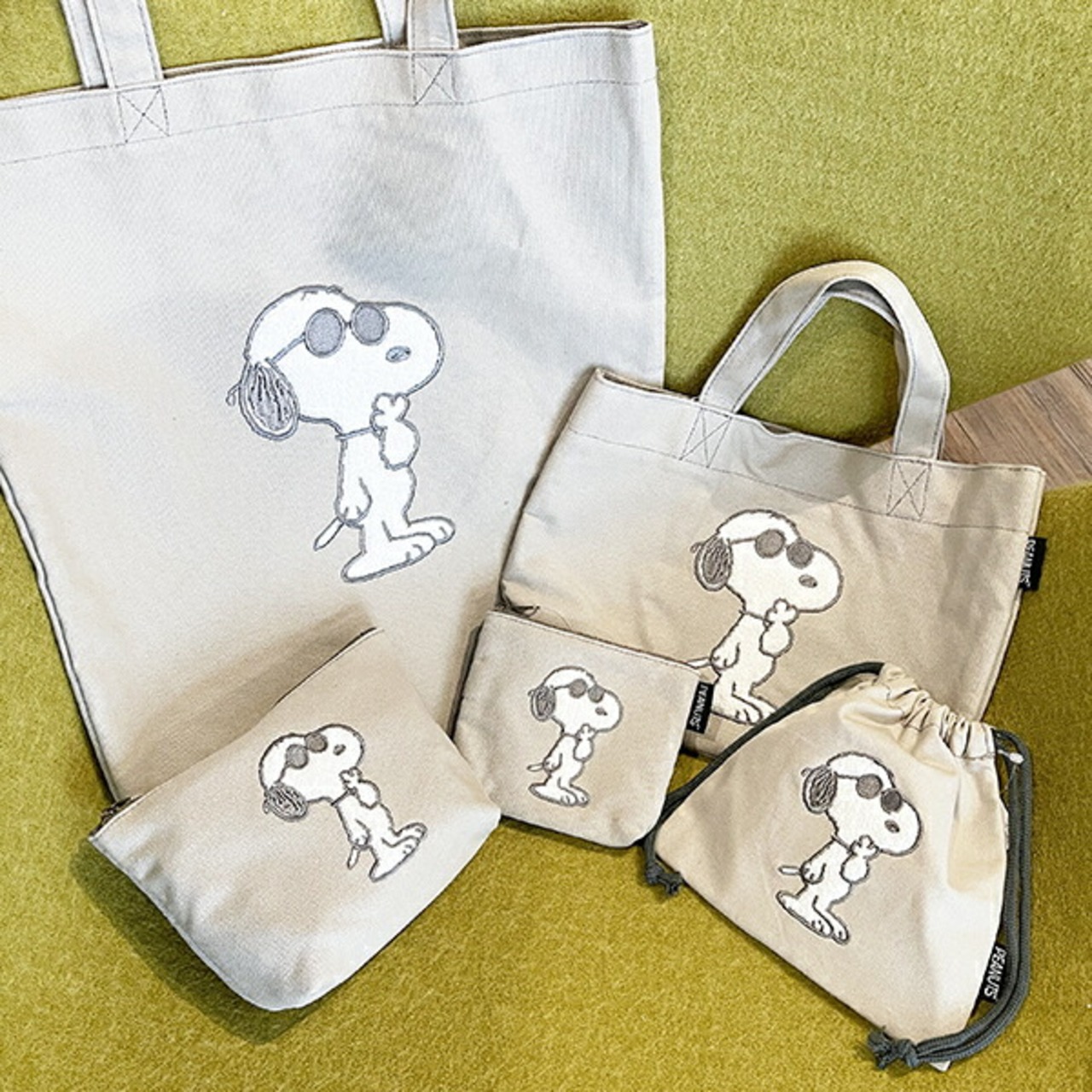 キャンバスのシンプルなカラー生地に、サガラ織りのスヌーピーのワッペンがオシャレなシリーズです。