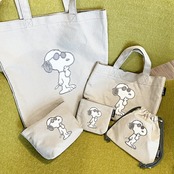 キャンバスのシンプルなカラー生地に、サガラ織りのスヌーピーのワッペンがオシャレなシリーズです。