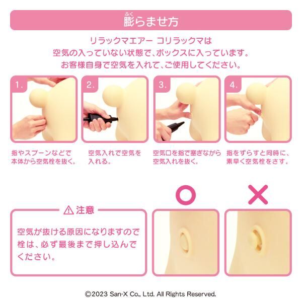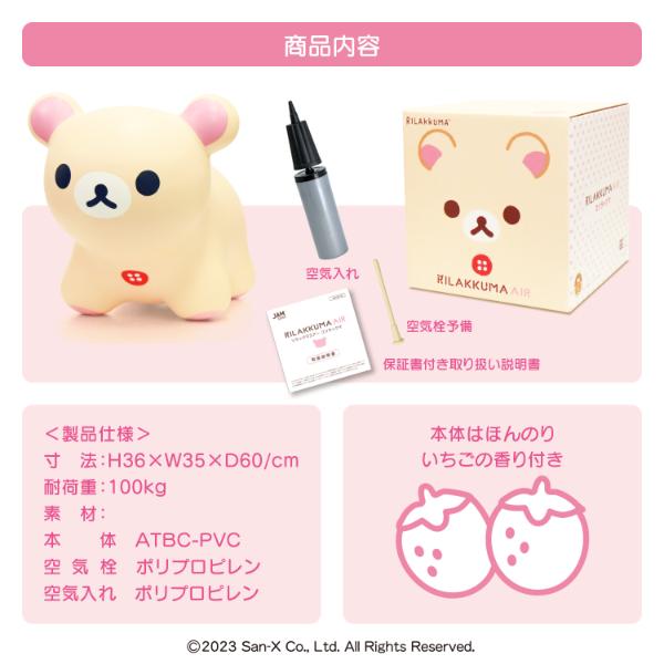 コリラックマの乗用トイ”コリラックマエアー”です。乗って遊んだり、ちょっともたれてゆっくりしたり、ソファで一緒にゴロゴロしたり、インテリアとしてもおすすめです♪パッケージもとても可愛いので出産祝いやお誕生日プレゼントなど贈り物にもおすすめです!(※ボックスサイズ:H300 ×W300×D300 mm)リラックマエアーと一緒に素敵な毎日をお過ごしください♪【セット内容:本体・空気入れ・空気栓予備・保証書付き取扱説明書】【耐荷重:100kg】