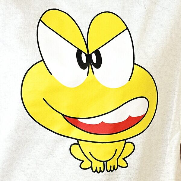 ど根性ガエルでお馴染み「ピョン吉」の今にも動き出しそうな強気な表情のTシャツです。ブラックとホワイトでお揃いも◎