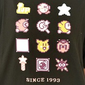 カービィの懐かしいドット柄のTシャツです。カービィやアイテムが大集合!キッズサイズもあるのでリンクコーデも◎
