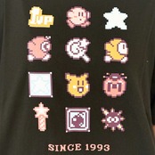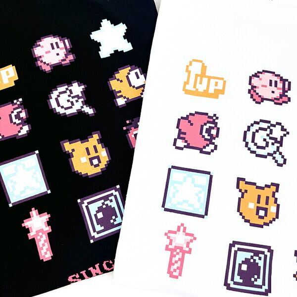 カービィの懐かしいドット柄のTシャツです。カービィやアイテムが大集合!キッズサイズもあるのでリンクコーデも◎