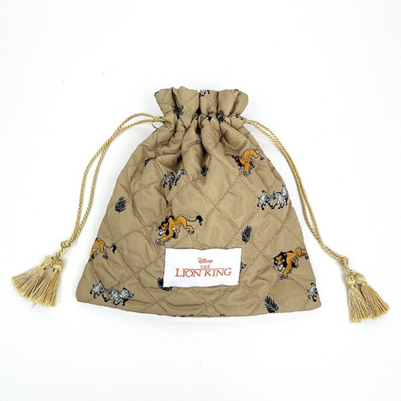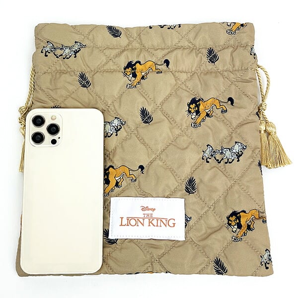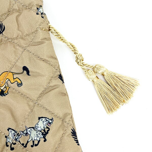 ライオンキングのキルティング巾着です。落ち着いたカラーと総柄がポイント♪程よいサイズ感でコスメや日用品を入れるのに◎本体に合わせたカラーのタッセルがかわいい☆