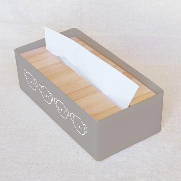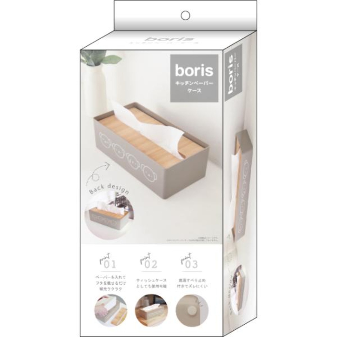 キッチンペーパー・ボックスティッシュなどを入れて使えるケースです。ペーパーが減るとフタが沈みます。両面にボリスの可愛いプリント付き◎底面にはすべり止め付きで安心。
