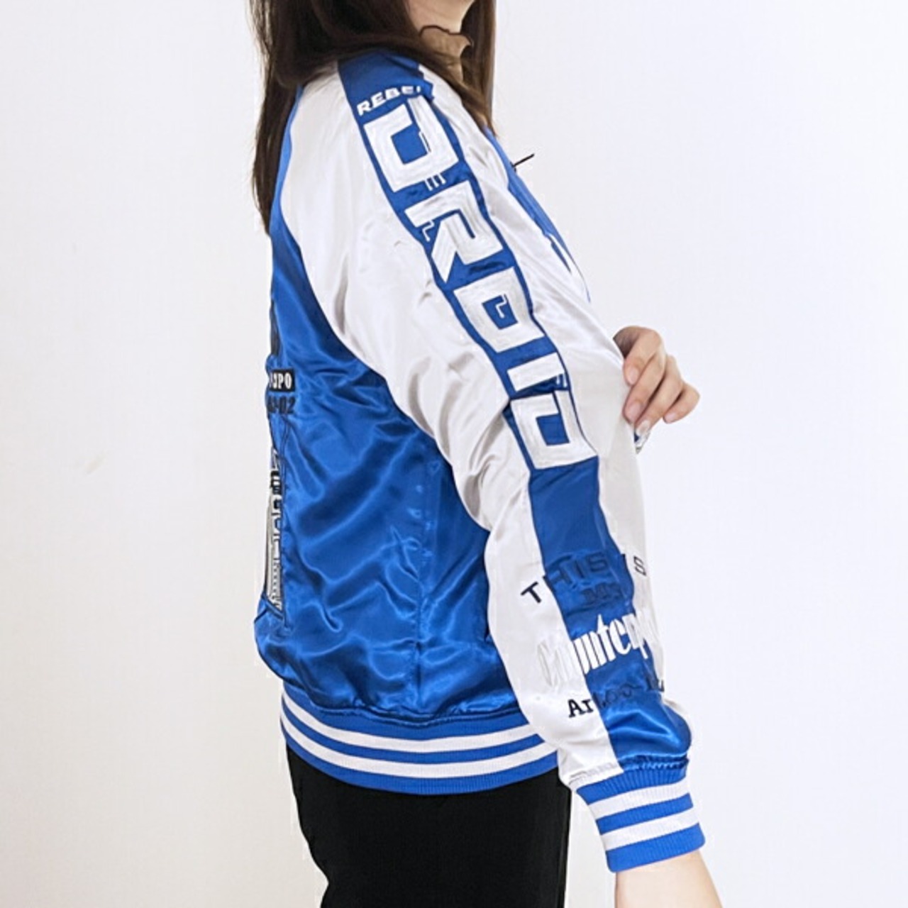 サテンの光沢ある生地で格好よく。バッグに大きくキャラクター刺繍されたスカジャンです。袖の部分や胸にもワンポイントが入っています。可愛くもカッコよくもコーデできちゃうアイテムです♪Lサイズですが、女性はダボっと着るのもおすすめ♪チェスト:96〜104cm 身長:170〜185cm
