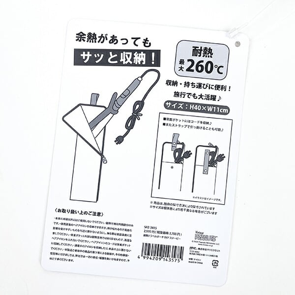 260℃の耐熱なのでヘアアイロンの予熱があっても収納できます。収納・旅行の持ち運びなどに便利です。背面ポケットにはコードを収納できます。ストラップで引っかけることもできます。