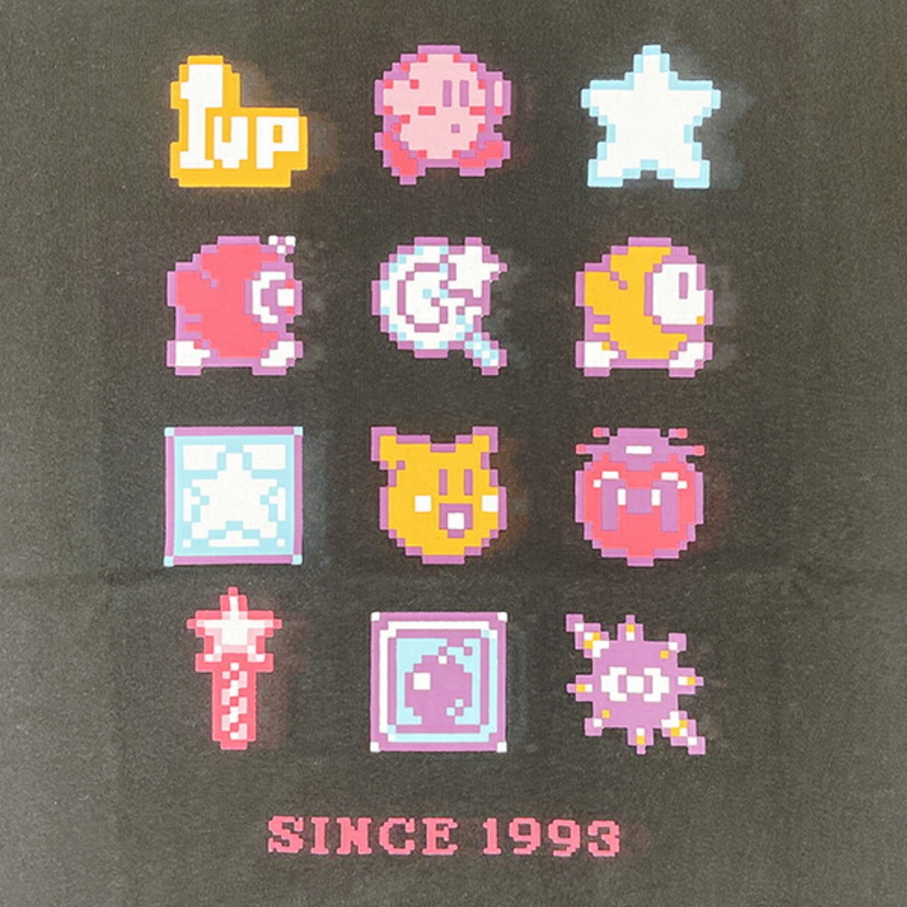 カービィの懐かしいドット柄のTシャツです。カービィやアイテムが大集合!大人サイズもあるのでリンクコーデも◎