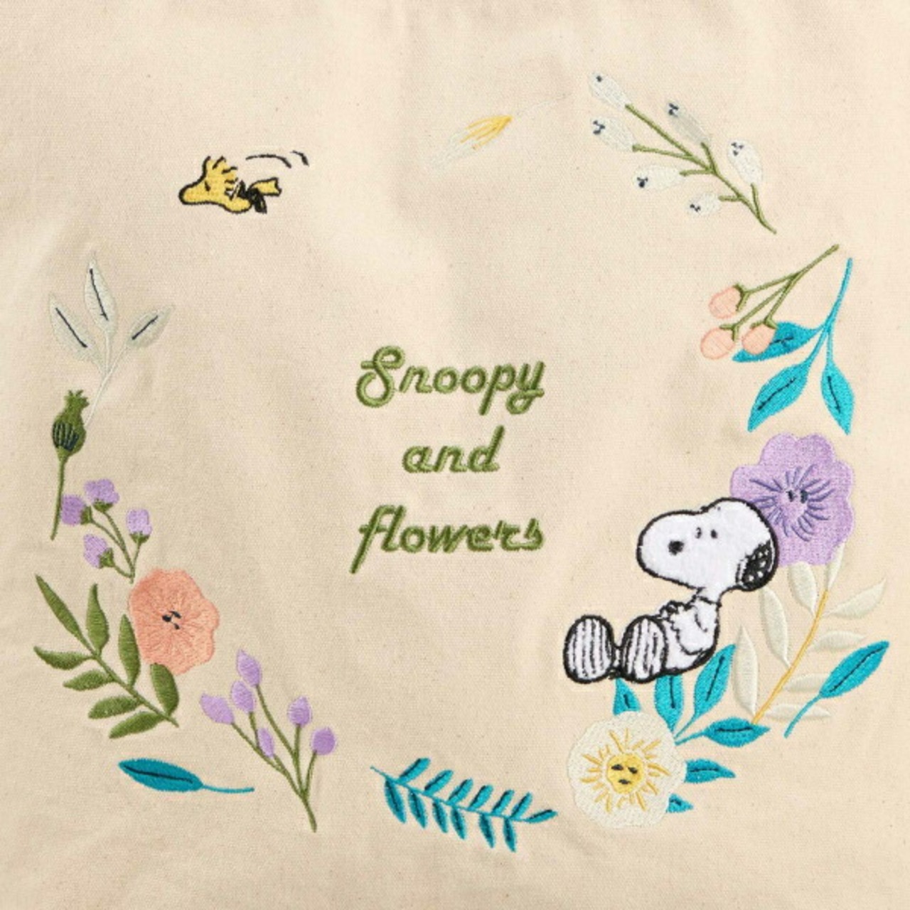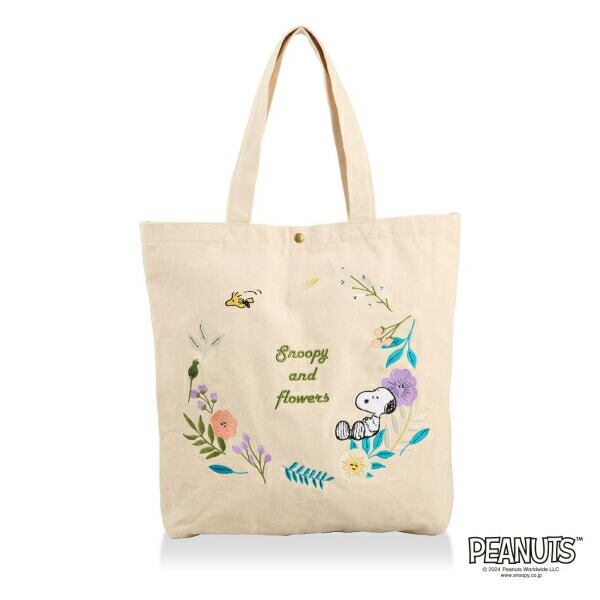 スヌーピー 刺繍 帆布トートバッグ ナチュラル (フラワーリース)