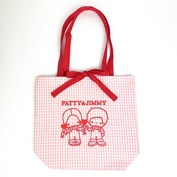 パティ&ジミーのトートバッグです。ギンガムチェックがかわいい♪A4サイズが入るマチ付きなので収納力抜群!リボンを結べばバッグの口を閉じることもできるので覗き見防止に。普段使いはもちろん、推しカラーやお好きなキャラクターを選んで推し活も◎世代を超えて愛されるあのキャラクターたちに出会えます☆