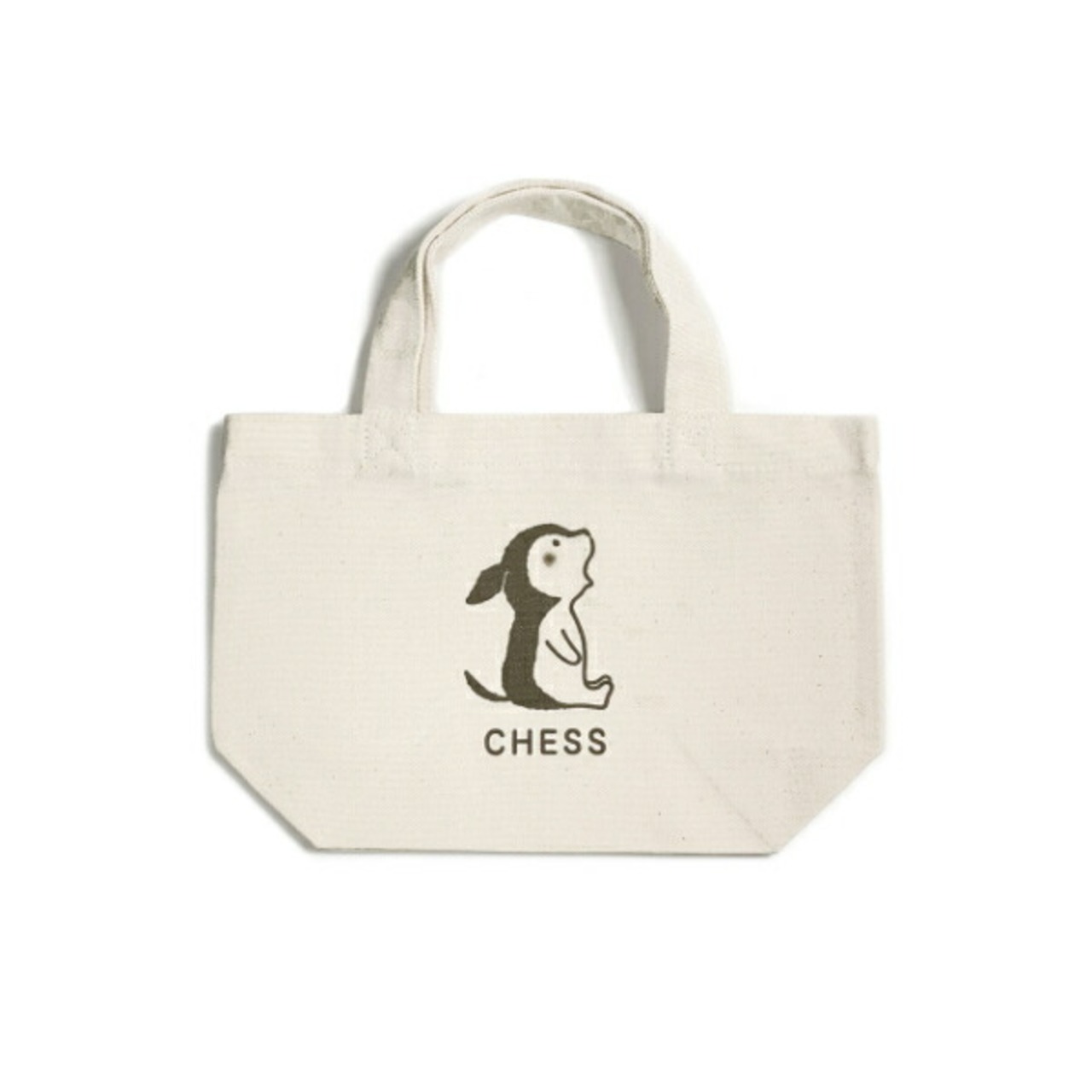 チェスくんのシンプルなキャンバスミニトートバッグ。しっかりとした厚みがあり、ホワイトに近いナチュラルなカラーなのでどんなコーデにも合わせやすいです。お弁当箱と500mlのペットボトルがぴったり入るサイズ。愛犬のお散歩バッグとしてもおすすめです。2023年春制作。