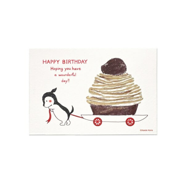 モンブランを一生懸命運ぶチェスくんのポストカード。お誕生日の家族やお友達へ贈るのにおすすめです。2022年秋制作。2024年5月より紙の素材を変更しリニューアルしました。
