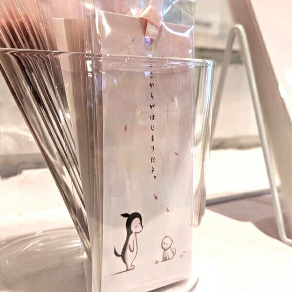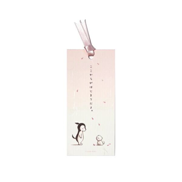 チェスくんとコジローが描かれている本の栞。春は出会いの季節。桜の花びらに誘われて、チェスくんがコジローと出会う瞬間を切り取った作品です。桜のイメージに合うように和風な高級紙を使用しています。「ここからがはじまりだよ」チェスくんらしさが出るように文言にもこだわりました。2024年春制作。