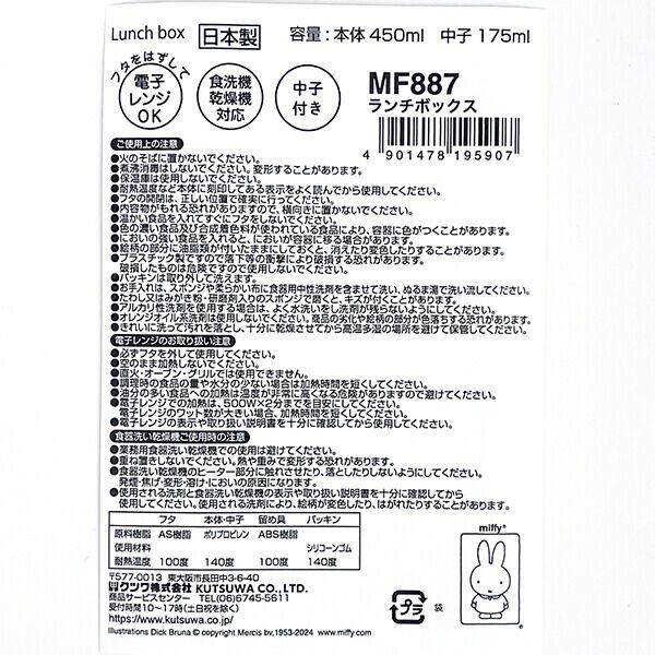 ミッフィーの世界に登場する、動物たちをモチーフにした「MIFFY & ANIMALS」シリーズ♪コアラやパンダなど、普段なかなか見かけないレアキャラも…このシリーズでは、さまざまな種類の動物たちが登場するようにデザインされています♪大人からお子様まで幅広くお使いいただけるかわいいお弁当箱!中子(二個)付きなのでおかずとご飯が仕分けできる♪フタを外して電子レンジ可◎食洗機・乾燥機対応◎安心の日本製◎【容量:本体450ml 中子175ml】
