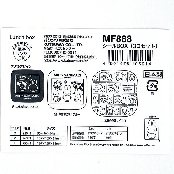 ミッフィーの世界に登場する、動物たちをモチーフにした「MIFFY & ANIMALS」シリーズ♪コアラやパンダなど、普段なかなか見かけないレアキャラも…このシリーズでは、さまざまな種類の動物たちが登場するようにデザインされています♪大人からお子様まで幅広くお使いいただけるかわいいお弁当箱!保存容器としても使い方色々♪フタを外して電子レンジ可◎安心の日本製◎【容量:(大)550ml (中)360ml (小)220ml】