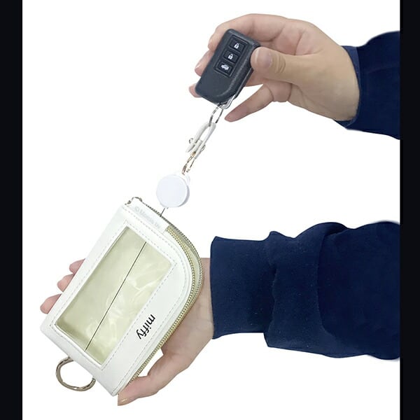 スマートキーだけでなく、免許証や定期なども入るポケット付きのマルチなポーチです。外リールと内リールを両方伸ばすことができるのでとっても便利◎