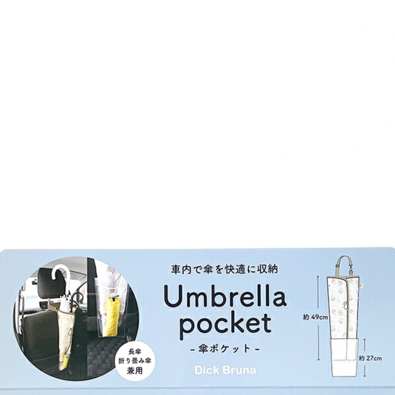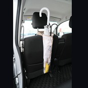 濡れた傘をそのまま収納できる、車内用傘ポケットです。ヘッドレストに持ち手を通して引っ掛けるだけ。長傘だけでなく、ビニールポケット部分には折り畳み傘も入るので便利です♪