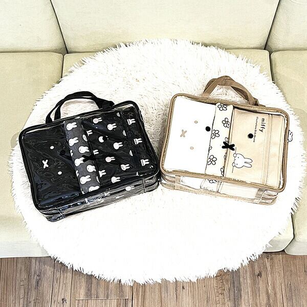 ミッフィーのトラベルポーチセットです。S、M、Lのサイズ違いで使い分けられる大きさで使い勝手の良いポーチセット☆旅行はもちろん、普段使いにも便利です♪化粧品や小物入れ、文房具入れなどにも◎外部のクリアポーチはクリアなので中身が確認しやすいので、スーツケース内の荷物整理にぴったり☆持ち手付きなので旅行先での洗面用具などを入れるのにも使えます♪【サイズ】外装:27cm×19cm×9cm、S:17cm×8cm×3cm、M:17cm×9cm×8cm、L:19cm×11cm×8cm