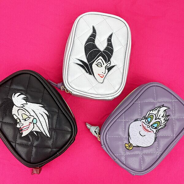 ディズニーヴィランズたちのシックでミステリアスなシリーズ◎インパクトのある顔の刺繍ポーチ。キルティング加工を施したふかっとした質感。内側には両面にゴム入りポケットがあり、コスメポーチとしても◎大きく口が開くので使い勝手も◎【内ポケット:オープン×3】