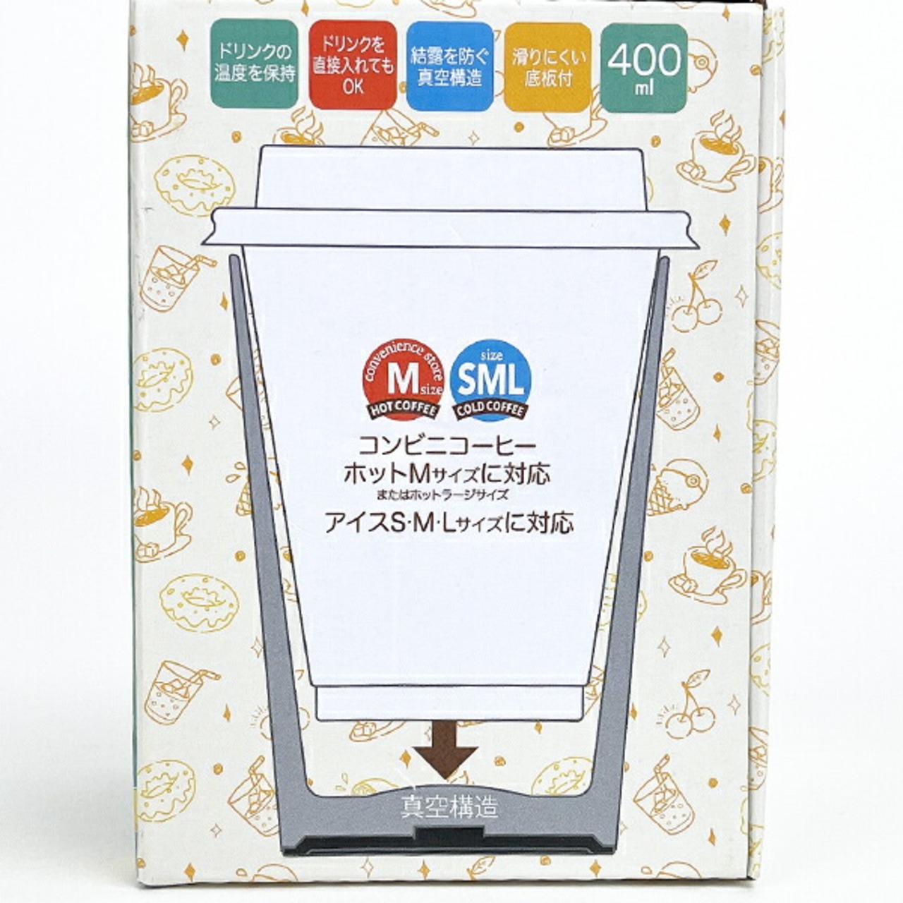 コンビニやコーヒーショップのコーヒーカップがすっぽり入る保温ステンレスタンブラー!コンビニエンスストア大手3社のサイズに対応!※各社の仕様変更などにより、カップが入らない場合があります。※真空二層構造でしっかり温度をキープしてくれるので、最後まで美味しくいただけます。結露も防ぐので、水滴でテーブルなどを汚す心配もありません。また、直接コーヒーやお茶など、飲み物を注いで保温保冷マグとしてもご使用いただけます。底面は滑りにくい底板付きで安心です。【容量:400ml】