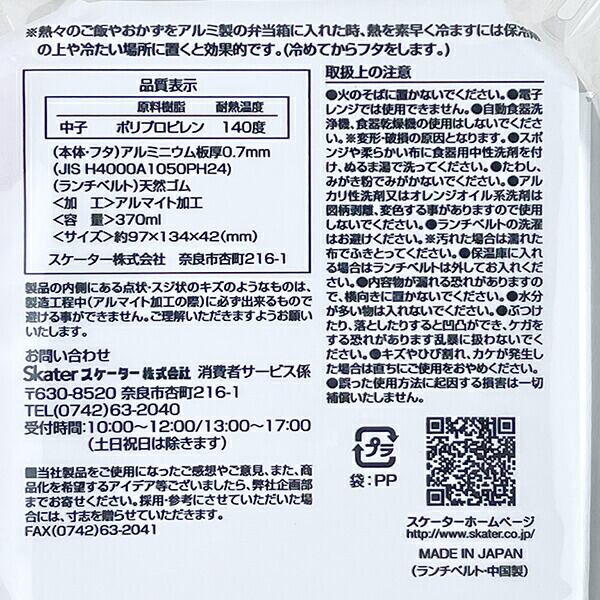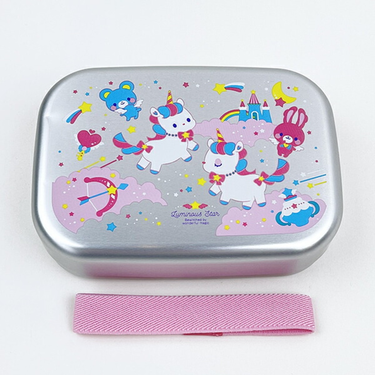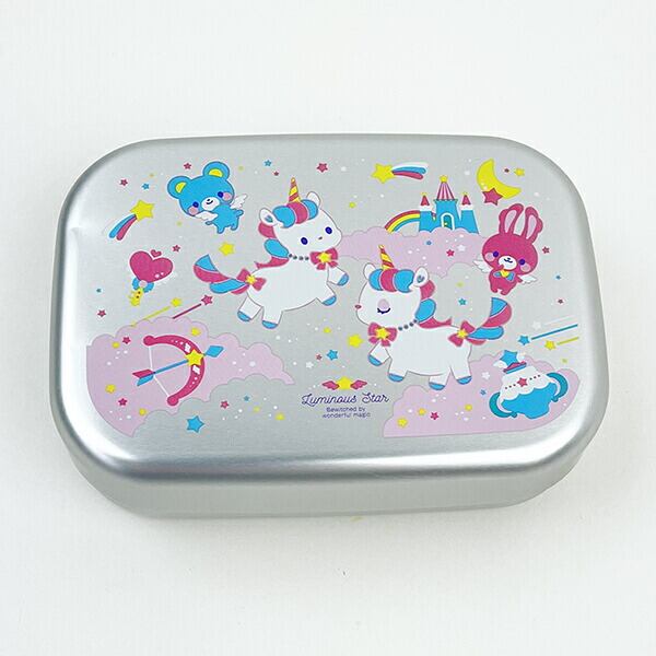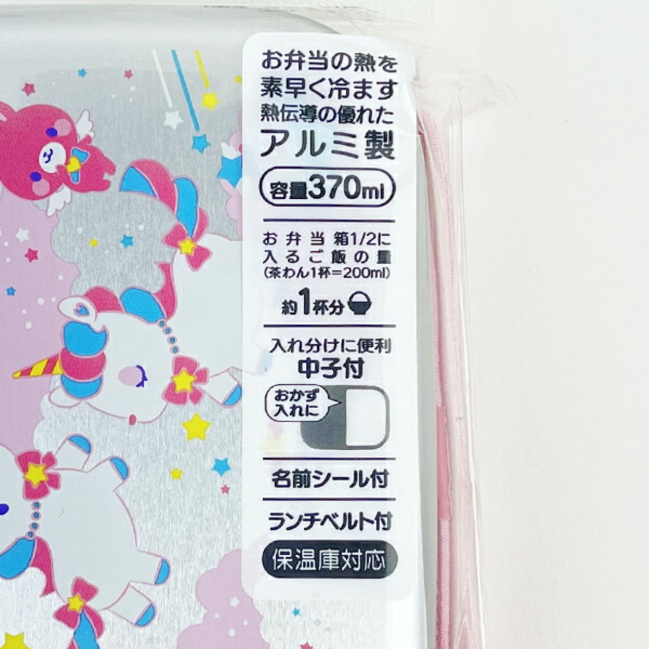 ユニコーンのアルミ弁当箱です。お弁当の熱を素早く冷ます熱伝導の優れたアルミ製。入れ分けに便利な中子付き。ランチベルト付きも嬉しいポイントです♪お名前シール入りなので保育園用にもおすすめ☆【容量:370ml】