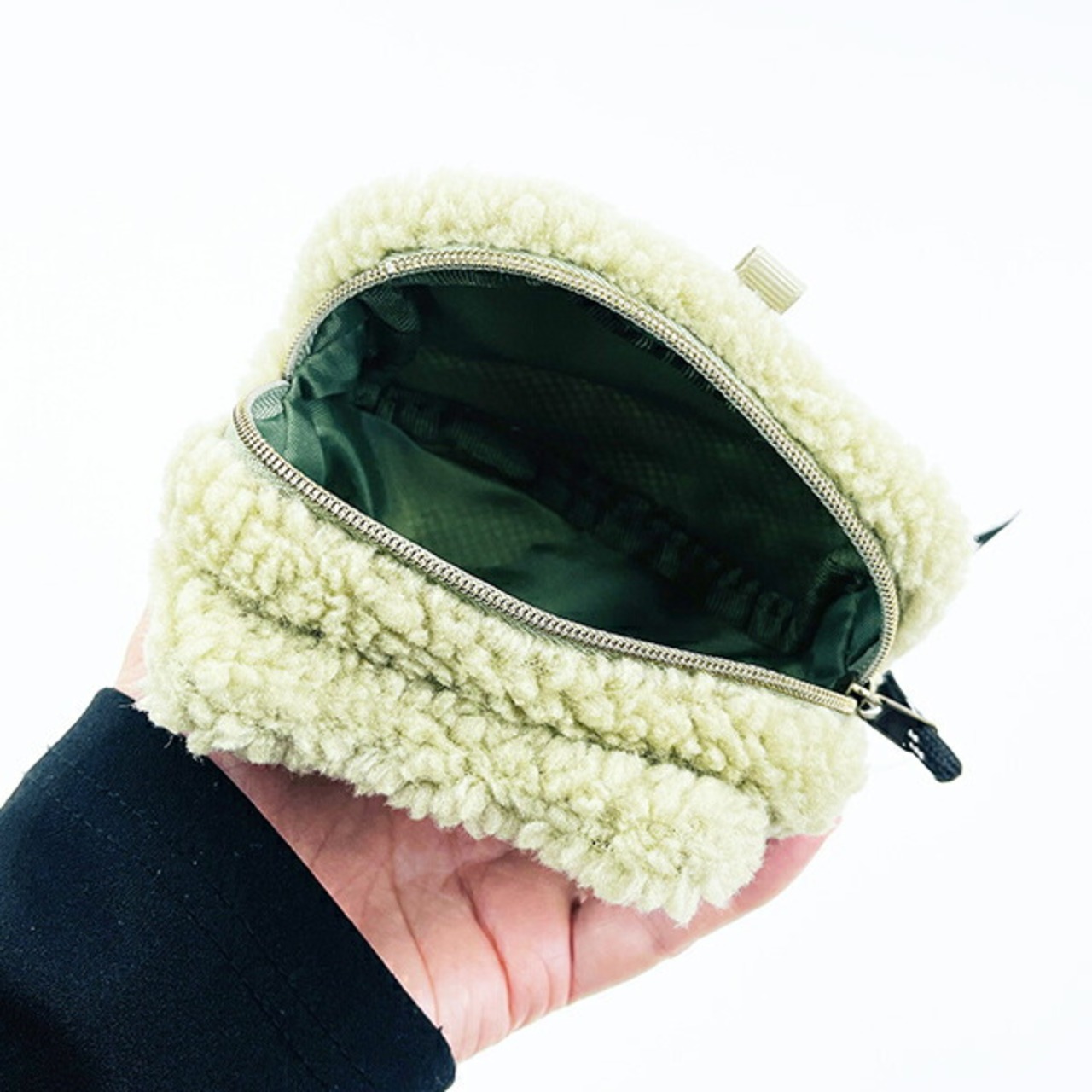 もこもこ生地がカワイイピクルスのダイカットフェイスポーチです。落ち着いたベージュに中生地のカーキが素敵なポーチです。