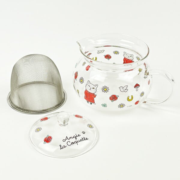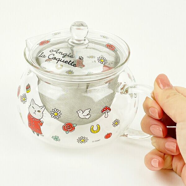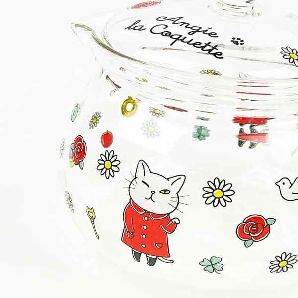 丸みを帯びた形がかわいい耐熱ガラスポットが登場です。ウインクしているアンシ?ーがキュート!ちょうど良いサイズ感でおうちや職場のひとときに。きれいな発色の秘密は国内での焼き付けです。ガラスにもこだわった、透明度の高い耐熱ティーポットです。 紅茶が大好きなアンジーと一緒にゆっくりティータイムをしませんか。同柄デザインのマグもお揃いでどうぞ!