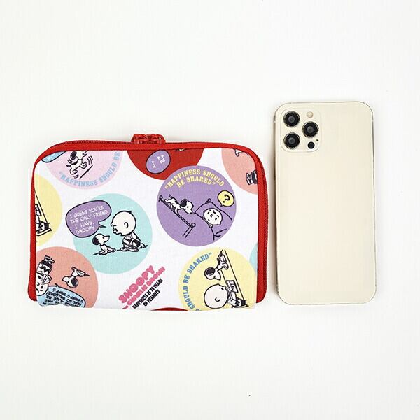 スヌーピーのどっとポーチです。パスポートやコスメなど小物を入れるのにピッタリなショートサイズ☆周年のお祝いにぜひお手に取ってみてください!