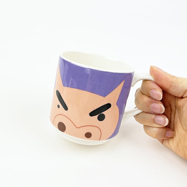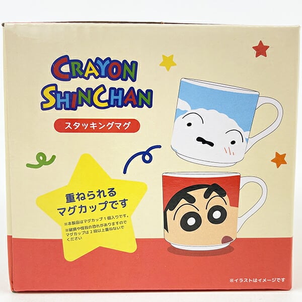クレヨンしんちゃんのスタッキングマグカップです。同じシリーズのマグカップを2個重ねられます!カップの裏と底のデザインにも注目です☆