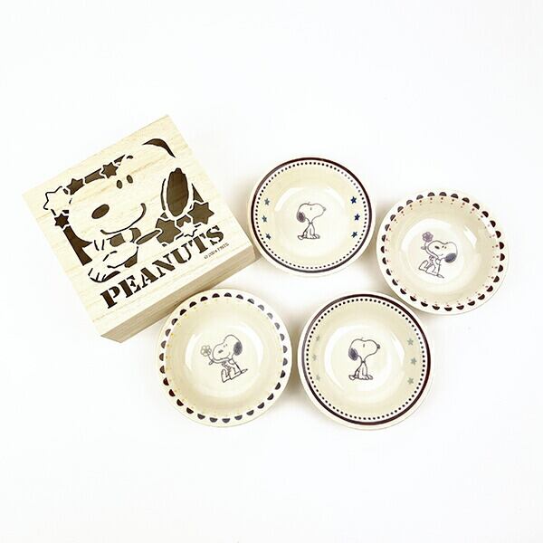 おしゃれな木箱入りのスヌーピーの食器セットです♪フルーツを入れても良し!サラダを入れても良し!お好きな物を入れて食卓を楽しみましょう☆彡木箱は可愛いスヌーピーが掘ってありお部屋に飾っても可愛いですよ〜♪◎セット内容:プレート×4【容量:約200ml】