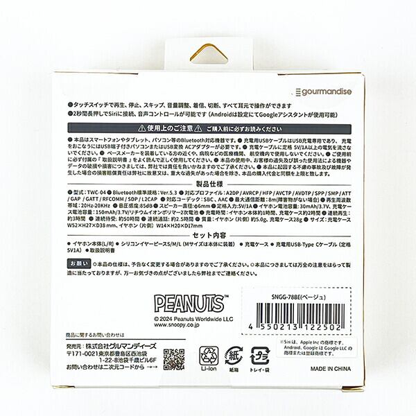 スヌーピーの完全ワイヤレスステレオイヤホンです。タッチスイッチで再生、停止、スキップ、音量調整、着信、切断、すべて耳元で操作ができる便利なイヤホン!2秒間長押しでSiriに接続、音声コントロールが可能です(Androidは設定にてGoogleアシスタントが使用可能)ケースとイヤホン本体にスヌーピーがデザインされていて可愛い♪スヌーピー好きの方にはたまりません〜☆【セット内容】イヤホン本体(L/R)、シリコンイヤーピースS/M/L(Mサイズは本体に装着)、充電ケース、充電用USB-Type Cケーブル(定格5V1A)、取扱説明書