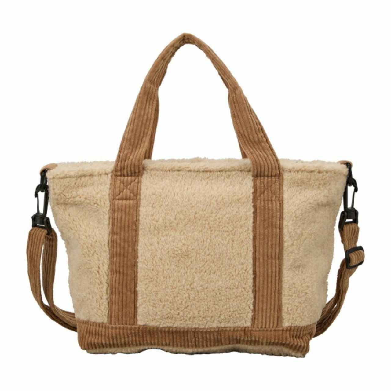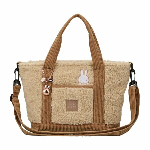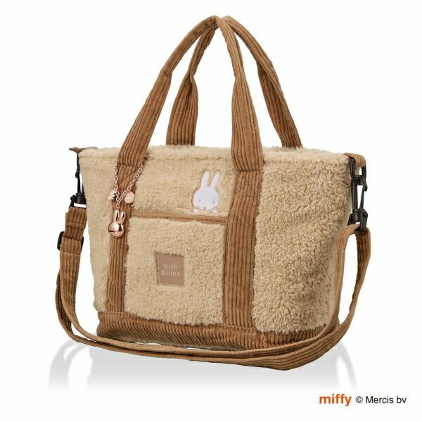 メインバッグとしてオススメなサイズの横型ボアトートバッグです。取り外し可能なショルダーベルトが付いているので、肩掛けにして使うこともできます。ショルダーベルトは長さ調節が可能です。また、マチも広く容量と収納力も抜群です。 バッグ前面にはフロントポケット付き。バッグの内装にもポケットが付いています。デザインにもこだわり、バッグ前面には「Dick Bruna」の文字があしらわれており、ミッフィーのお顔のワンポイント刺繍に加え、プレミアム感漂うミッフィーのチャーム付き。内装もミッフィーのお顔の総柄。細部までミッフィーデザインにこだわっています。落ち着いた色合いのブラックとアイボリーの2色展開です。【容量:約10L】