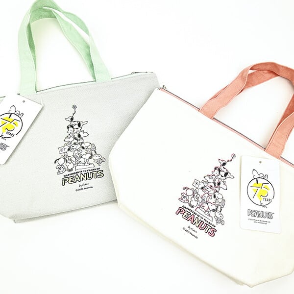 スヌーピーのランチバッグです。スヌーピーの歴史が詰まった75thデザインがキュート♪マチ付きが嬉しいポイント☆ランチのお供に◎スヌーピー好きの方はぜひ周年のお祝いにいかがですか♪