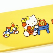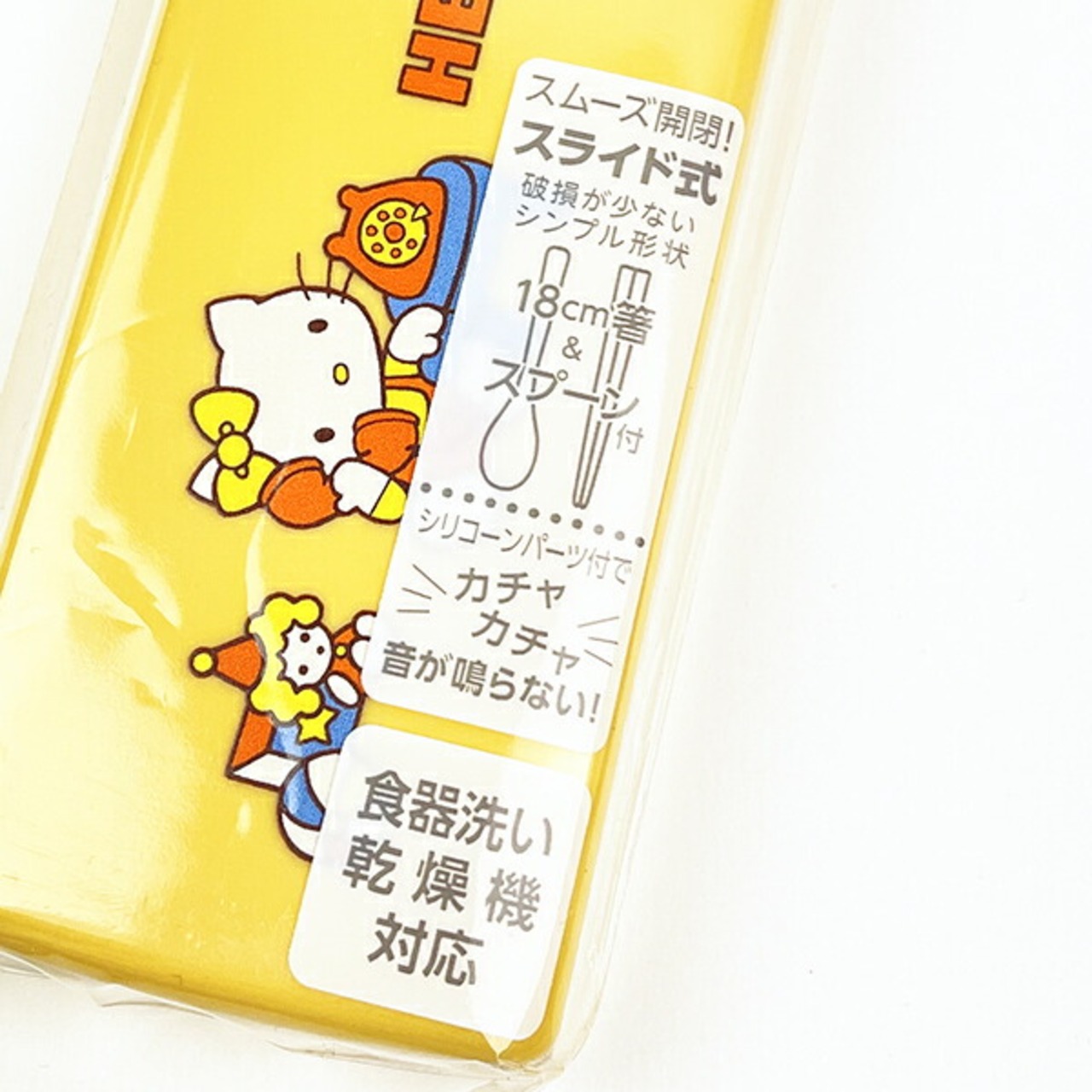 ハローキティの箸+スプーンの引フタコンビセットです。ホワイト色の箸とオレンジ色のスプーンがセットになっています。スライド式で開閉しやすい!シリコーンパーツ付でカチャカチャ音が鳴らないのが嬉しいポイント☆キティちゃんたちが遊んでいるデザインがとてもキュートです♪食洗機使用可◎