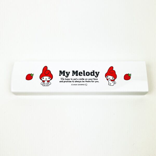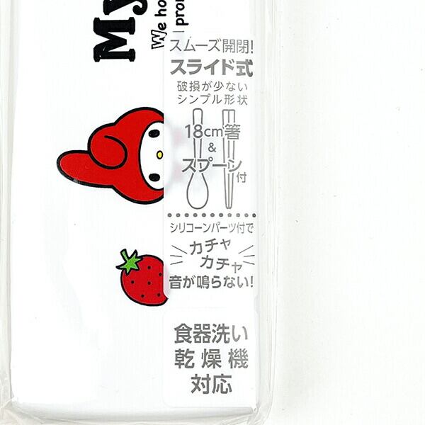 マイメロディの箸+スプーンの引フタコンビセットです。ピンク色の箸とホワイト色のスプーンがセットになっています。スライド式で開閉しやすい!シリコーンパーツ付でカチャカチャ音が鳴らないのが嬉しいポイント☆マイメロちゃんといちごデザインがとてもキュートです♪食洗機使用可◎