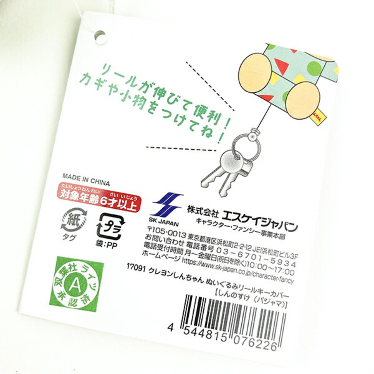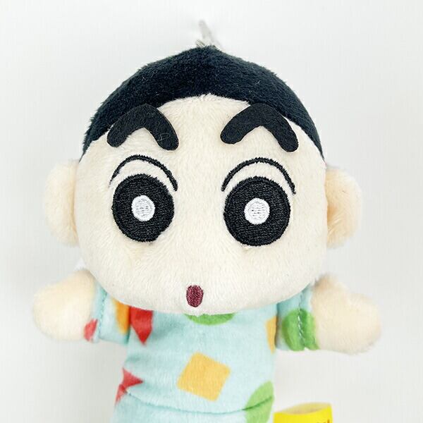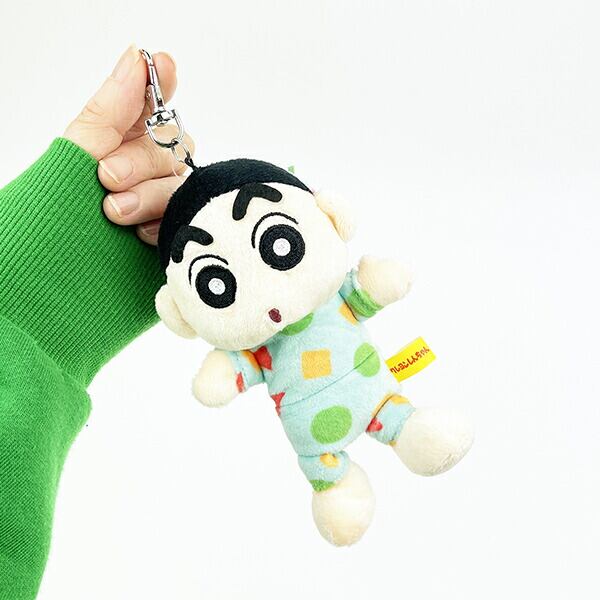 パジャマを着たしんちゃんのぬいぐるみリールキーカバーです。リールが伸びて便利!カギや小物をつけてね!