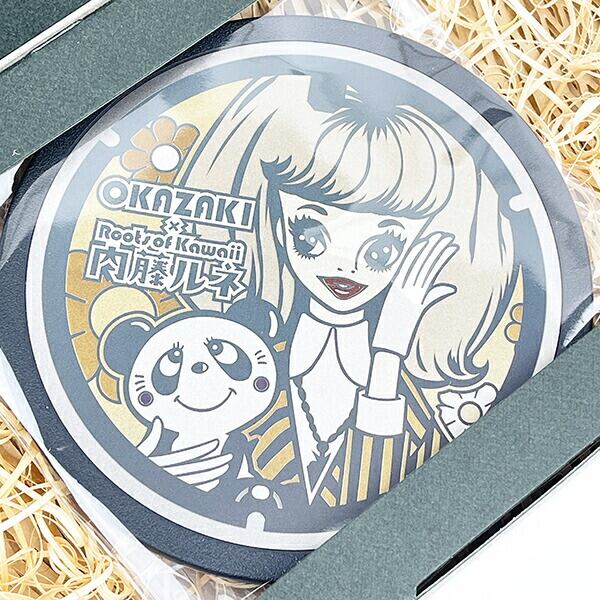 独特な感性と多彩な才能で今や世界中に広がる日本独自の「Kawaii」文化の原型を作ったアーティスト内藤ルネ。ルネガールと日本初のパンダキャラクターのルネパンダ、背景にはサンフラワーがデザインされています。ヤスオカのレーザー技術を使い着色ではない発色によって愛知県岡崎市で見ることのできるカラフルなマンホールをミニチュアマンホールで再現しました。ぜひ手にとってルネの「Kawaii」世界観をお楽しみください。7色展開の「オレンジ」です。